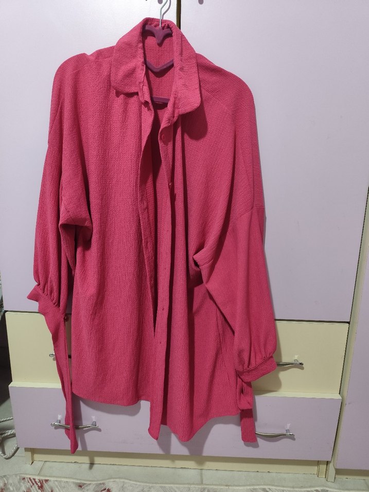 Hiç kullanmadim. Pembe keten kumaştan, uzun kollu, düğmeli, yakası kesik detaylı, normal midi uzunlukta bol kesim gömlek.
