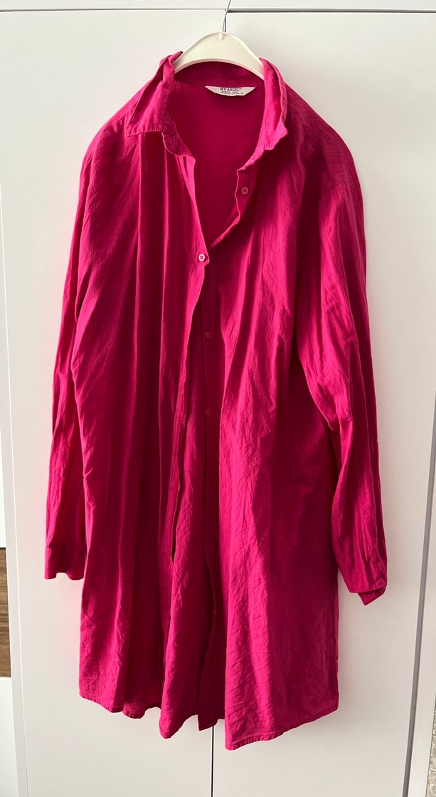 Pembe keten gömlek, yakalı ve düğmeli, bol kesim ve uzun kollu, bohem tarzda günlük kullanım için uygun. Az kullanıldı 40-42 uyumlu