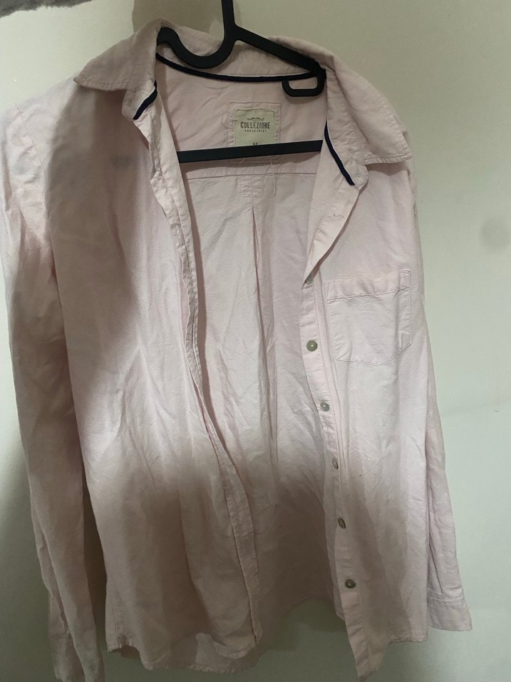 Pastel pembe keten gömlek, uzun kollu ve yakası çıtçıtlıdır. Salaş kesim ve midi boyda, günlük rahat sokak stili için uygundur.