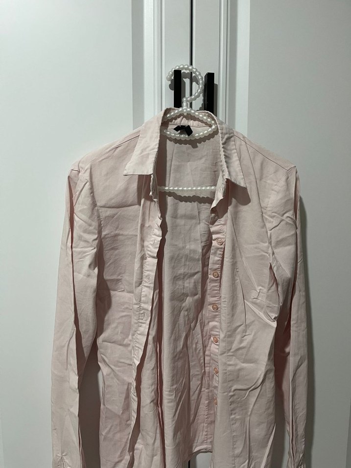 Pembe keten kumaştan, yakalı ve düğmeli, uzun kollu, normal boyda, ofis için uygun kadın gömleği.