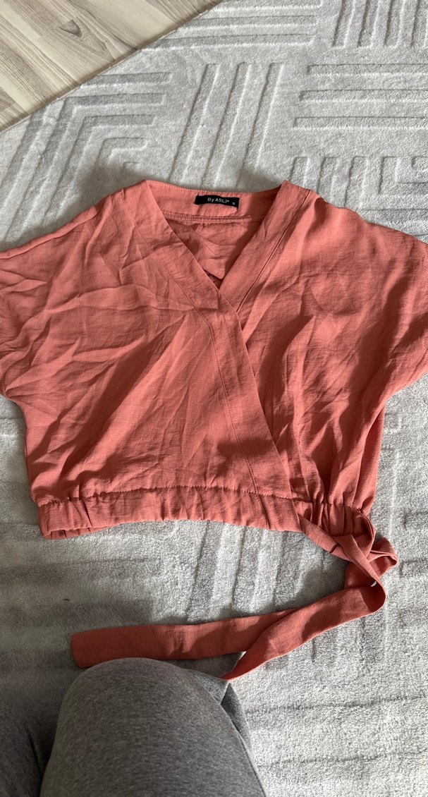 Keten kumaştan, pembe renkli, kısa kollu, V yakalı, salaş kesim ve bağlamalı detaylı rahat bluz.