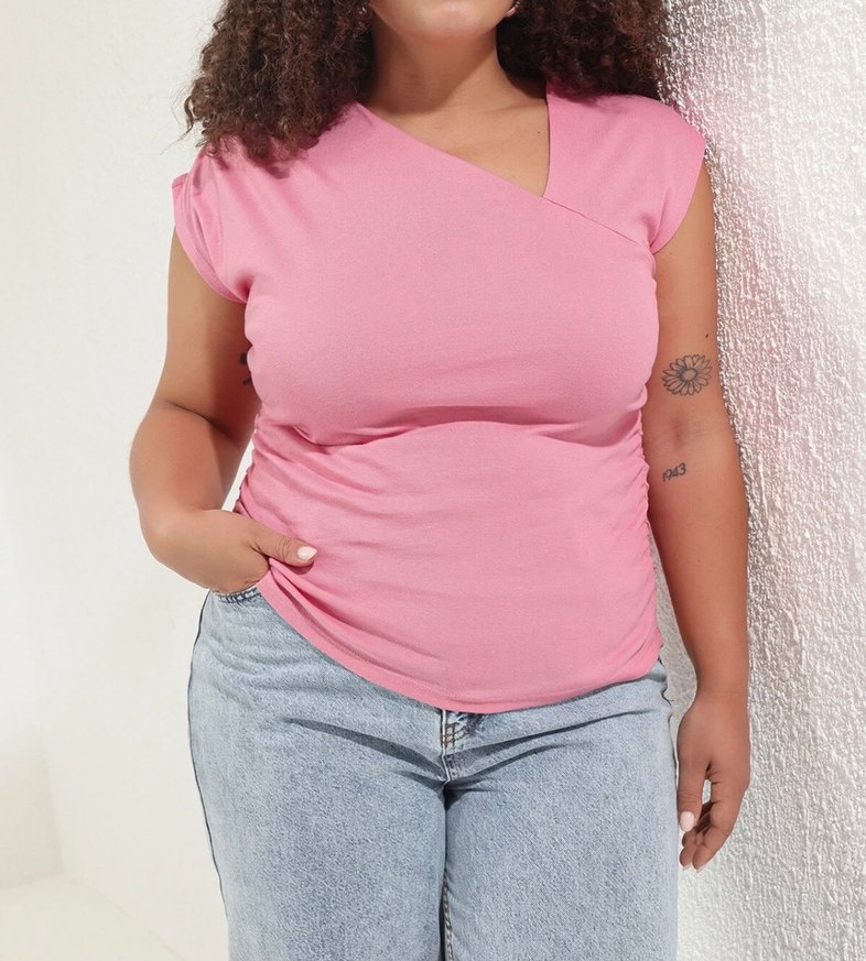 Pembe pastel renkte, keten kumaştan, V yakalı ve kolsuz kadın tişörtü. Salaş kesimi ve drapeli detaylarıyla modern athleisure tarzında, günlük kullanıma uygun.