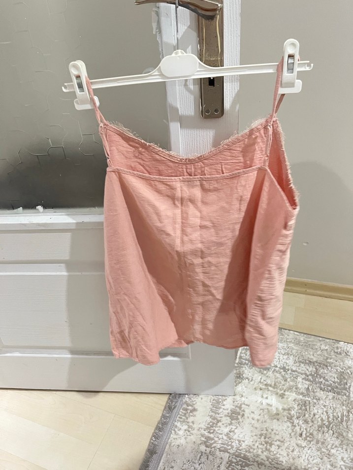 Keten kumaştan yapılmış, pembe pastel renkte, V yakalı ve kolsuz mini bluz. Rahat ve bol kesimiyle günlük kullanıma uygundur.