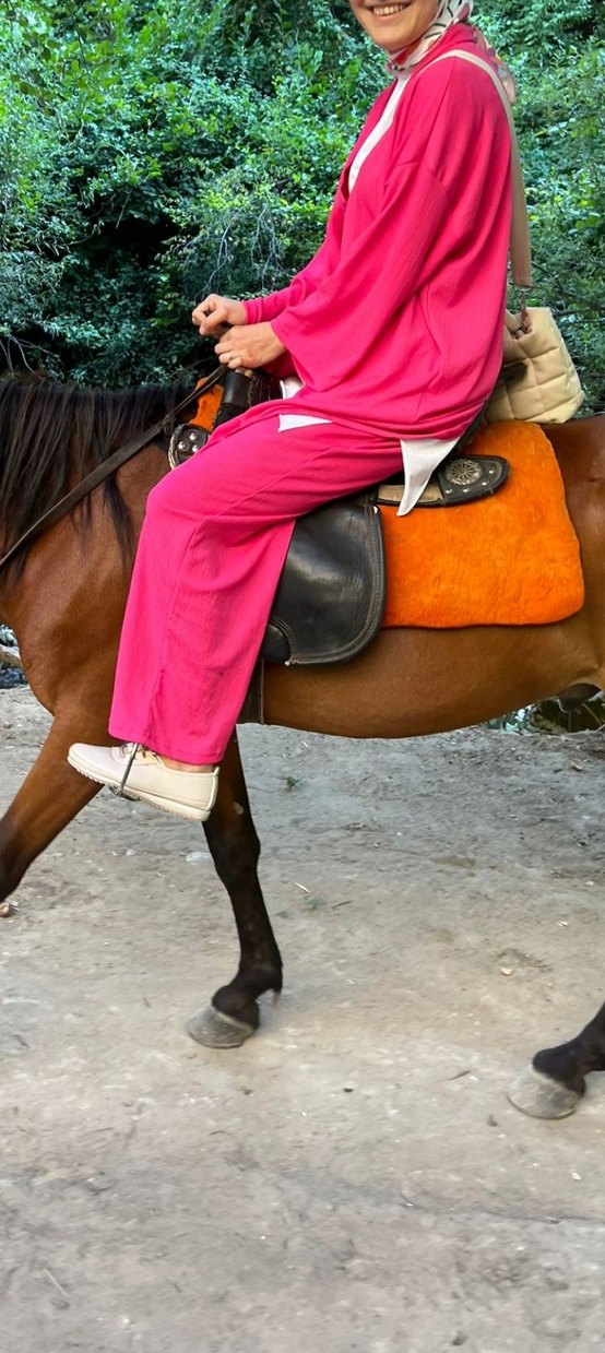Pembe renkli, kemerli ve süet kumaştan yapılmış, uzun paça ve dar kesim pantolon. Günlük kullanıma uygun canlı renkte.
