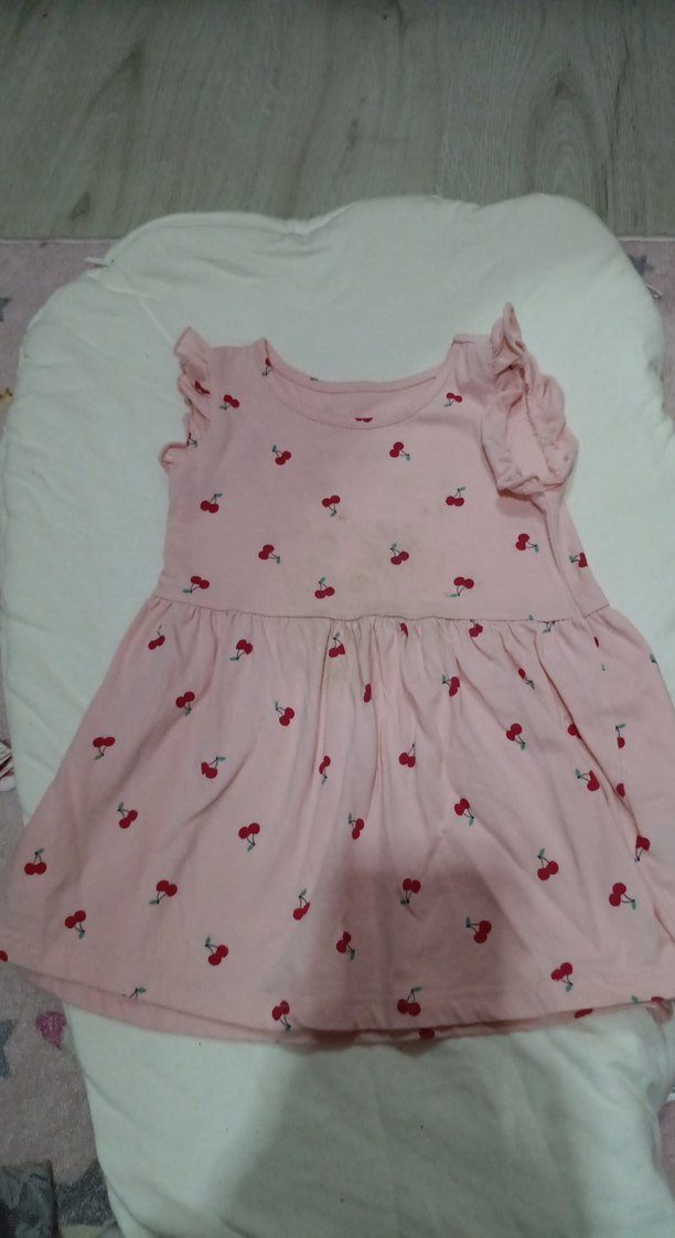 Pembe kiraz desenli, kolsuz ve omuzlarında fırfır detaylı kız elbisesi. Yumuşak sentetik kumaştan üretilmiştir, rahat ve salaş bir sokak tarzı sunar.
