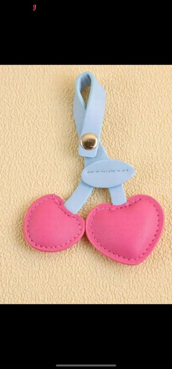 Pastel pembe renkte, iki kiraz figürlü, açık mavi bantlı ve citcitli kadın anahtarlığı. Rahat ve retro tarzı yansıtıyor.