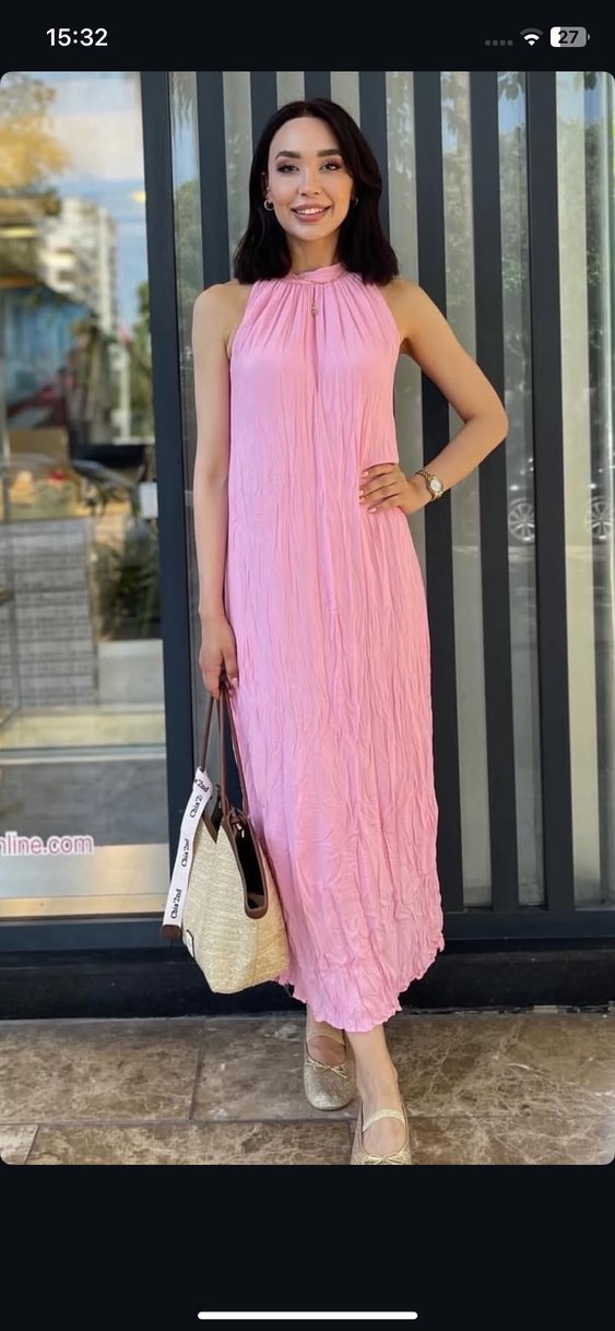 S-M-L beden seçeneği❤️ Geniş kalıp pembe renkli, kolsuz uzun elbise,bol kesim ve bohem tarzındadır, günlük kullanıma uygundur.