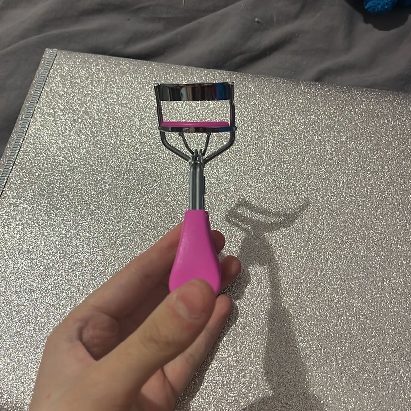 Pastel pembe saplı, metal çerçeveli kirpik kıvırıcı. Rahat tutuşlu ve klasik tasarıma sahip.