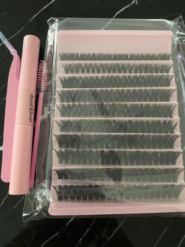 Açık pembe takma kirpikler ile birlikte uygulama için fırça ve aparat içerir.