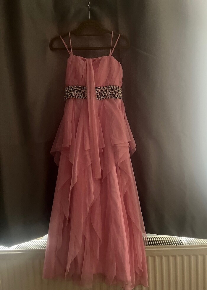 Pembe kısa beli inci boncuk işlemeli ip askılı Abiye