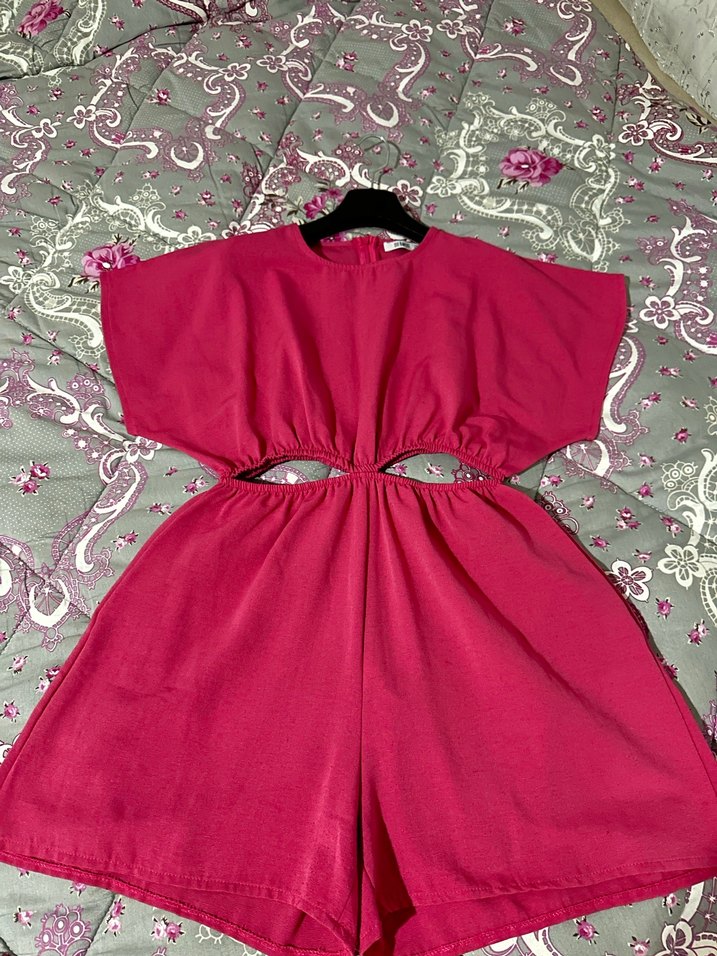 Salaş kesim kısa pembe tulum. Kısa kollu ve belde kesik detayları bulunur. Bohem tarz için uygundur.