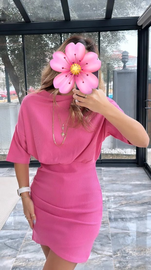 Pembe pastel tonlarında, yüksek yakalı, kısa kollu ve drapeli tasarıma sahip, vücuda oturan mini elbise. Sentetik kumaştan yapılmıştır, parti için uygundur. Sadece evde davet için giyildi.