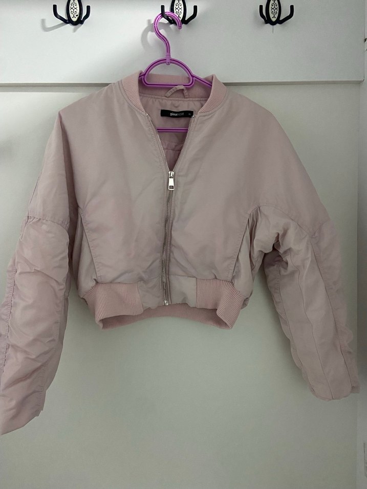 Pastel pembe renkte, sentetik kumaştan üretilmiş, kısa kesim, fermuarlı kadın ceket. Uzun kollu ve yakalı tasarımıyla günlük sokak stiline uygun.