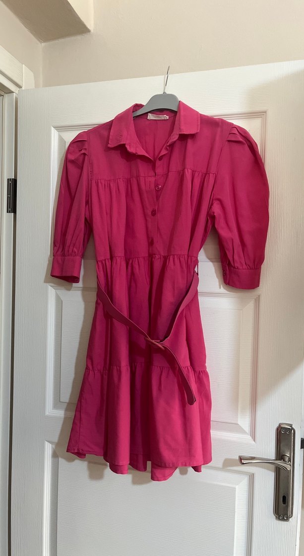 Pembe kısa belden açılan gömlek elbise. Kemerli pembe elbise. L xl uyumlu 2 3 kez giyildi