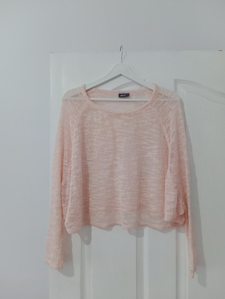 Pembe pastel renkte, uzun kollu, kısa kesim ve yuvarlak yakalı kadın kazak Yumuşak keten kumaştan örülmüş, rahat kesim, günlük sokak stili için uygun.