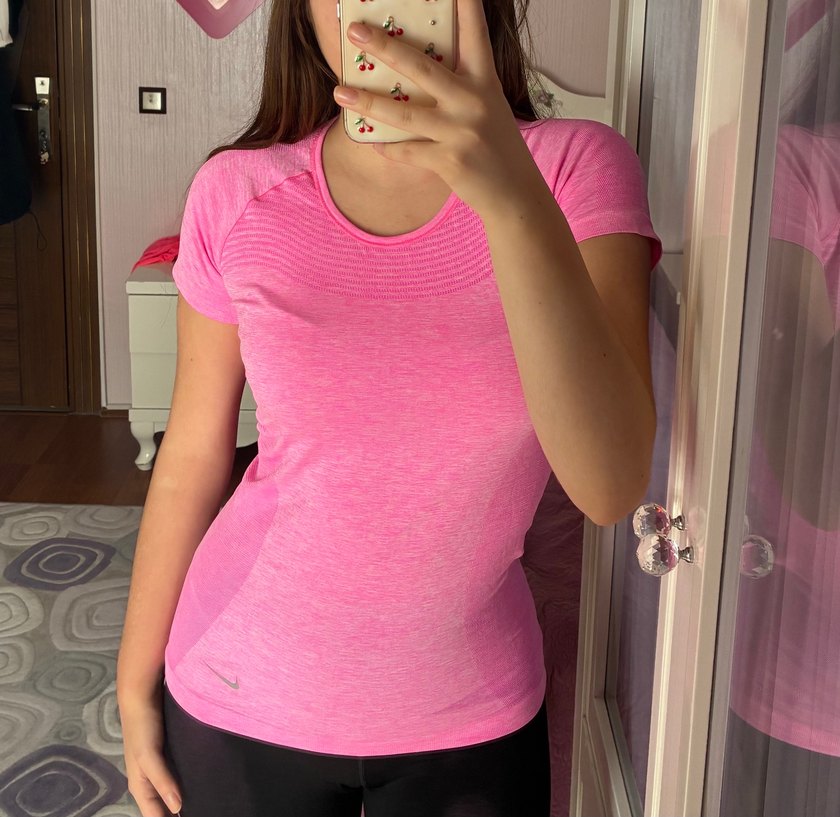 Pembe, kısa kollu, yuvarlak yakalı, vücuda oturan, yumuşak sentetik kumaştan tişört, spor ve günlük sokak stiline uygundur. orijinal nike.