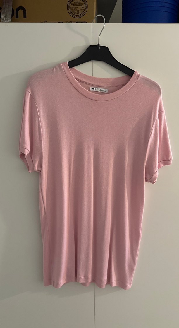 Pembe renkte, kısa kollu ve yuvarlak yakalı, yumuşak ve ipeksi kumaştan üretilmiş rahat kesim erkek tshırt