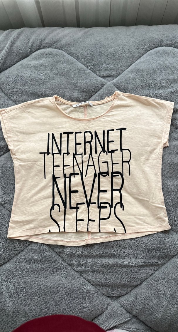 Pembe renkli, keten kumaştan, kısa kollu ve yuvarlak yakalı rahat kesim bir kadın tişörtü. Üzerinde "INTERNET TEENAGER NEVER SLEEPS" baskısı bulunur, günlük sokak stiline uygundur.
