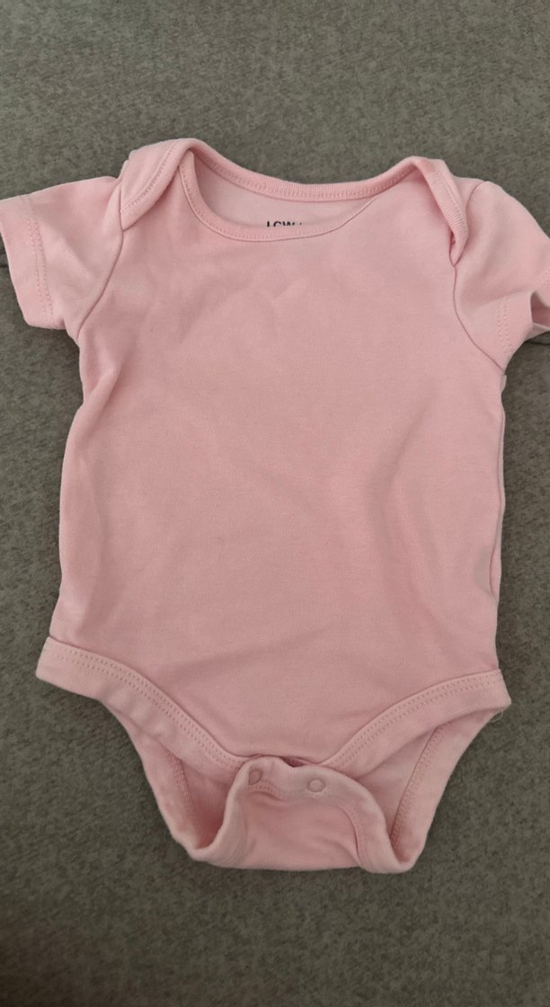 Pastel pembe renk, kısa kollu ve yuvarlak yaka bebek kız body, sade ve şık tasarıma sahip. Yakada ufak bir iz var ekledim 1-3