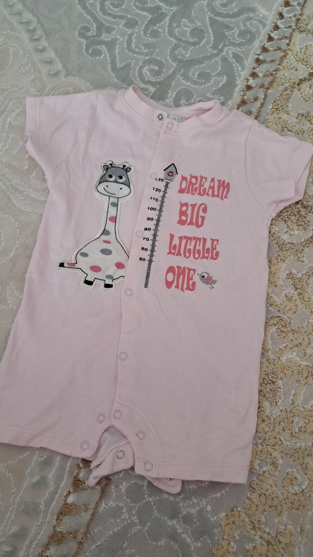 Pembe kısa kollu, yuvarlak yaka bebek tulumu, baskılı zürafa ve dantel detaylıdır. Üzerinde 'Dream Big Little One' yazısı vardır.