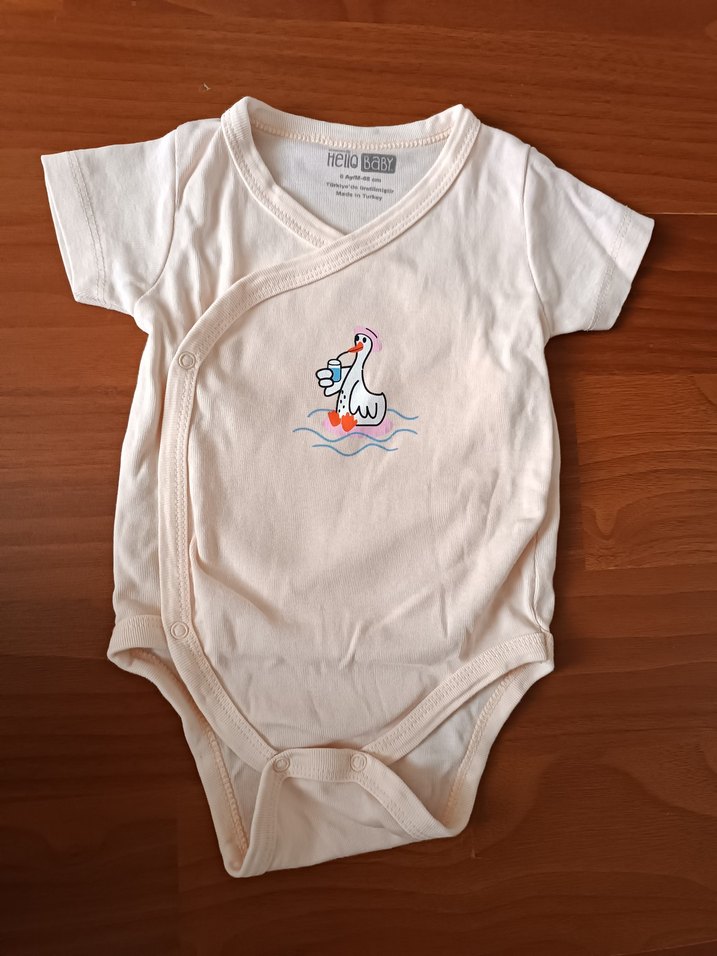 Beyaz renkli, kısa kollu ve V yakalı bebek zıbını, sevimli ördek baskısına sahip. Yumuşak pastel tonlarda, rahat ve şık bir tasarım.