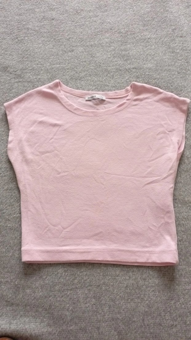 pastel pembe renkte, keten kumaştan, kısa kollu, yuvarlak yaka ve bol kesim düz crop . tanesi 150