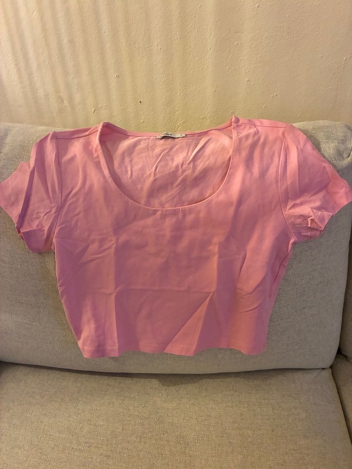 Pembe renkli, kısa kollu, geniş bisiklet yaka crop top. vücuda oturan 158 55 kg 80B