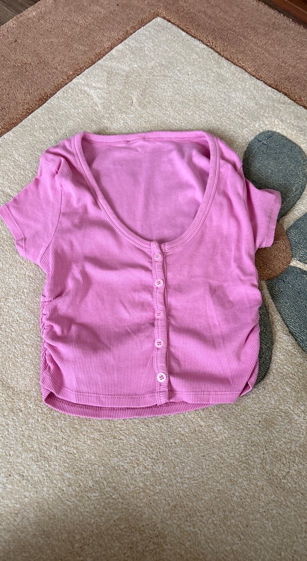 Düğmeli, kısa kollu ve yuvarlak yakalı pembe tişört. Yumuşak keten kumaştan, trend ve rahat bir tarz sunar.