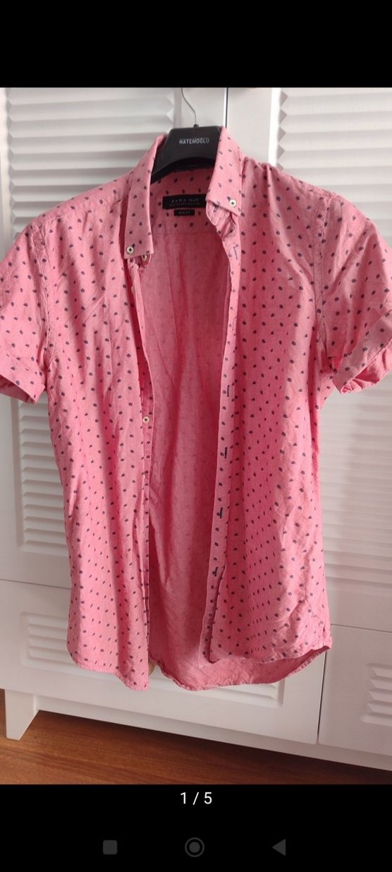Pamuk kumaştan yapılmış, pembe renkte kısa kollu ve bol kesim erkek gömleği. Yaka detaylı ve düğmeli, gündelik sokak stili için uygundur.