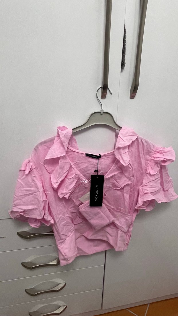 Pastel pembe keten kumaştan, kısa kollu, V yakalı ve fırfırlı detaylara sahip, bol kesim ve kısa boyda günlük sokak stili bluz.