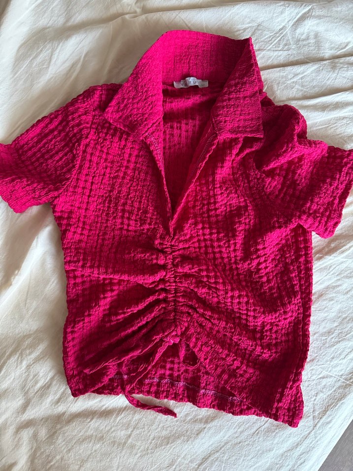 Pembe renkli keten bluz, kısa kollu ve yakalıdır. Düğmeli ve ön kısmı büzgülü, rahat ve fit kesimlidir. Bohem tarzına uygun bir sokak kıyafetidir.