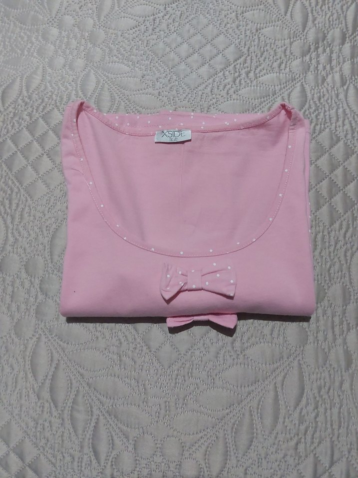 Pembe pastel renkte, kısa kollu ve bisiklet yaka, kısa boy ve vücuda oturan gecelik Küçük fiyonk detayı bulunur.