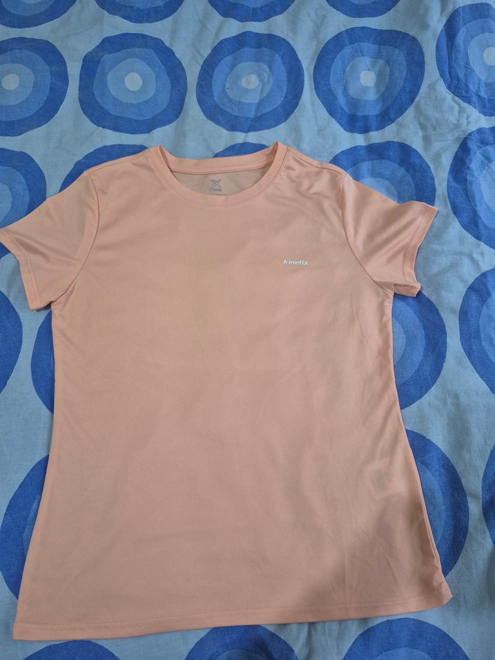 Pembe pastel renkte, kısa kollu ve yuvarlak yakalı, vücuda oturan kadın tişörtü. Yumuşak sentetik kumaştan yapılmış, günlük kullanıma uygun sade ve şık bir parça.