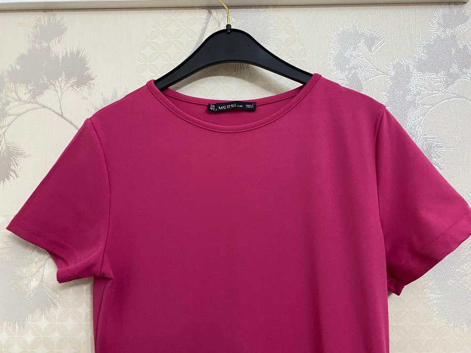 Pembe fuşya renkte, yuvarlak yaka ve kısa kollu, üste tam oturan kadın elbise. Yumuşak sentetik kumaştan üretilmiş, günlük kullanım için minimal ve zahmetsiz şık görünüm sunar. ✨ Hiçbir lekesi yoktur. yalnızca bir iki kere giydim.