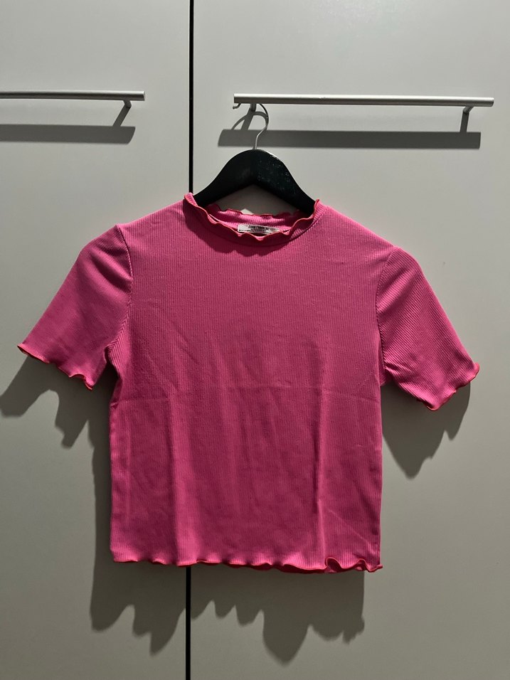 Pembe renkli, kısa kollu ve bisiklet yaka kadın tişörtü. Sentetik, yumuşak kumaştan üretilmiş, kısa ve vücuda oturan kesim. Günlük rahat kullanıma uygun.