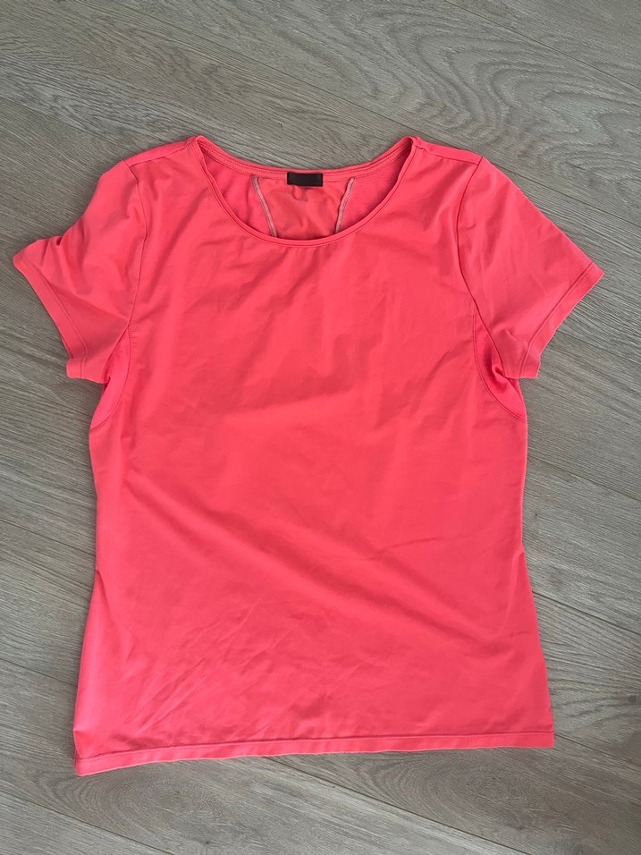 Pembe renkli, kısa kollu ve yuvarlak yakalı kadın tişörtü. Düz ve desen içermeyen, sentetik kumaştan üretilmiş, sportif ve sokak modasına uygun, normal uzunlukta ve vücuda oturan kesimde.