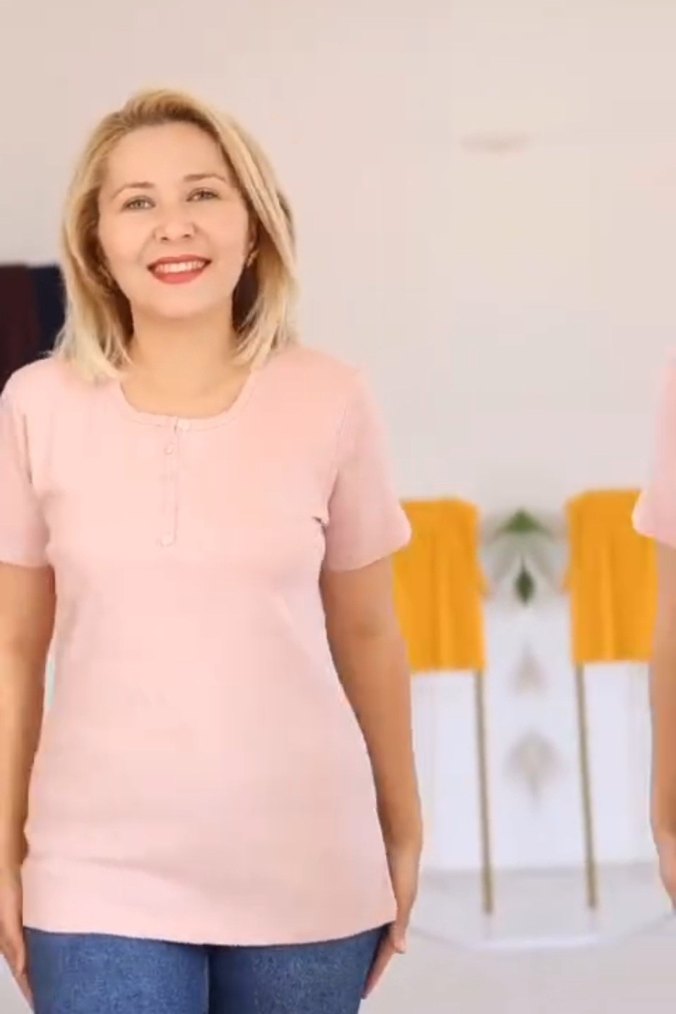 Pembe pastel renkte, kısa kollu ve yuvarlak yakalı kadın tişörtü. Pamuklu yumuşak kumaştan, rahat ve şık bir günlük kullanım ürünü. L Xl ve Xxl bedeni mevcuttur