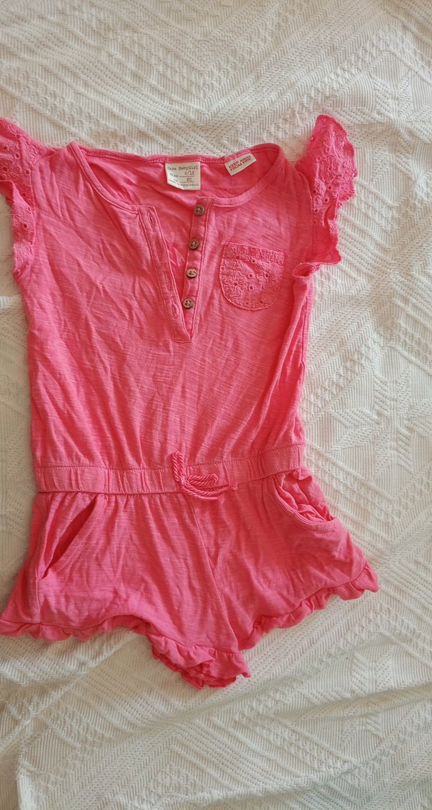 Pembe keten kumaştan, bol kesim kısa kollu kız tulumu. Düğmeli ön ve göğüs cebine sahip, bohem tarzda, fırfırlı kenarlar.