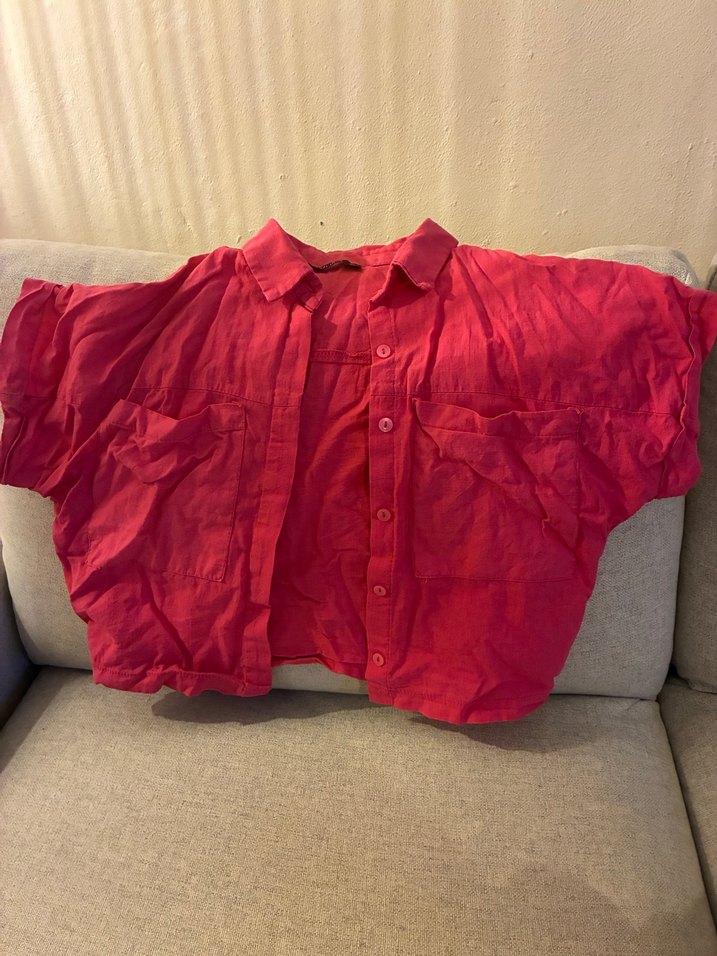 pembe crop pamuklu ketenimsi kumaştan, düğmeli, kısa kollu, yakalı ve bol kesim gömlek bedeni 40 ama 38 gibi düşünülebilir