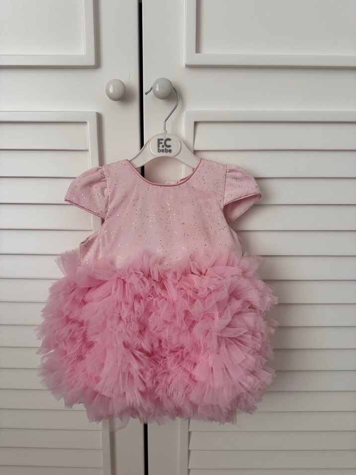 Kısa kollu, yuvarlak yakalı, pembe tonlarında bağlama desenli kız çocuk elbisesi. Yumuşak sentetik kumaştan, katmanlı fırfırlarla hacim kazandırılmış etek kısmı bulunur.