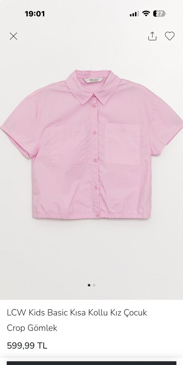 Pamuklu, kısa kollu, düğmeli, yakalı, pastel pembe renkli,Kısa boy ve sade tasarıma sahip. sadece 1.kez giyildi etiketi mevcut etiket fiyatı 600 TL