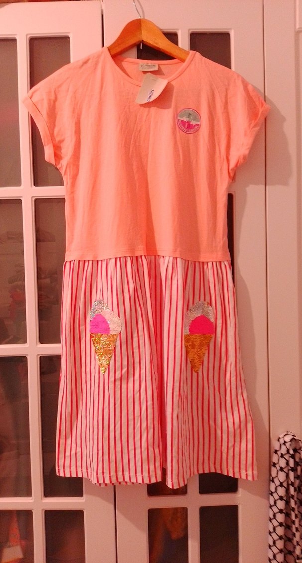 Pembe renkli, kısa kollu, yuvarlak yaka ve bol kesimli kız elbisesi. Pilili etek kısmında kırmızı çizgiler ve dondurma baskıları bulunur. hiç giyilmedi aldığım gibi duruyor etiketde üstünde zaten.