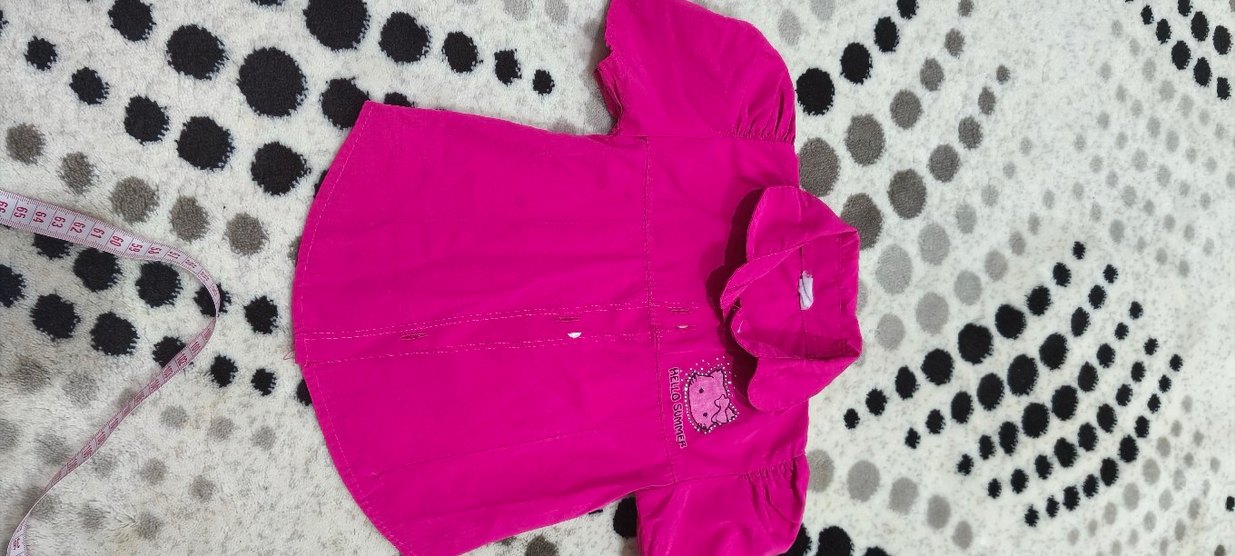 Düğmeli, kısa kollu ve yakalı pembe kız gömleği. Yumuşak ve sıcak dokulu kumaştan, renkli baskılı detaylara sahip.