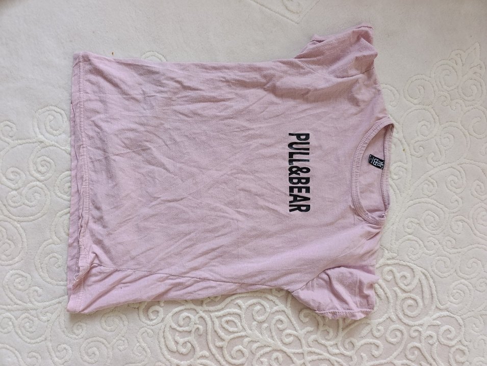 Yumuşak keten kumaştan, kısa kollu ve bisiklet yaka pembe kız tişörtü. Üzerinde PULL&BEAR baskısı bulunan rahat kesim, sokak stili için uygun.