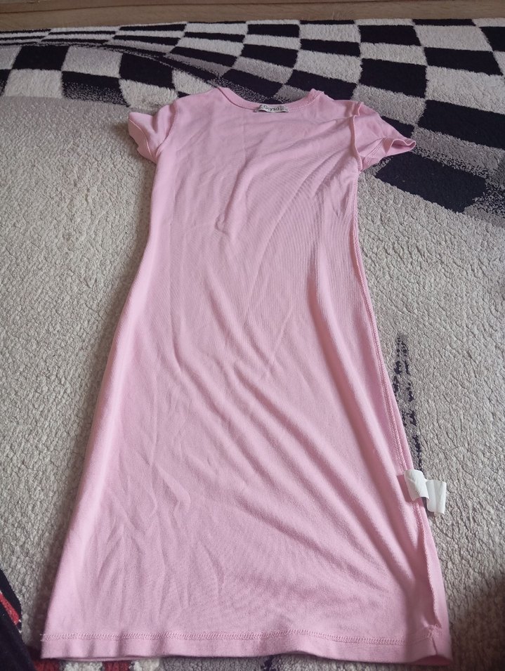 Pembe renkte, kısa kollu, midi boy ve vücuda oturan kesime sahip elbise. Yumuşak sentetik kumaştan üretilmiştir, günlük kullanım için uygundur.