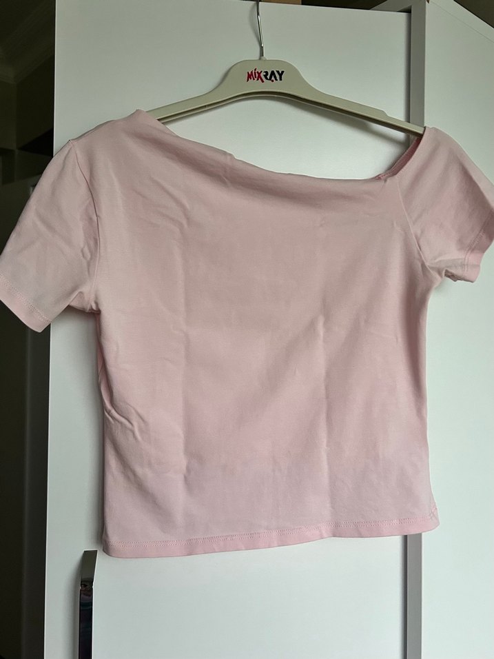 Pamuklu, pastel pembe kısa kollu, tek renk, salaş kesim ve mini boy, rahat ve şık günlük kullanım için uygun. MIXRAY markalı.