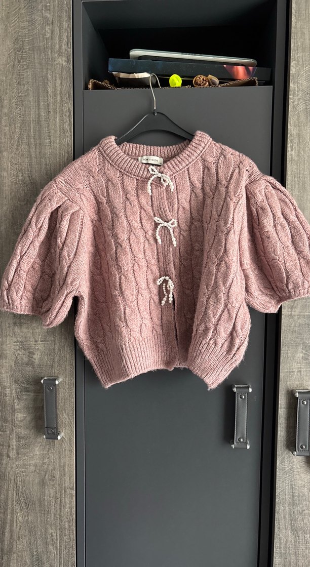 Pastel pembe renkli, bol kesim kısa kollu, yuvarlak yakalı örgü kazak. Kısa boyu ve önündeki bağcık detayıyla rahat ve şık bir görünüm sunar. Büyük beden crop kazak