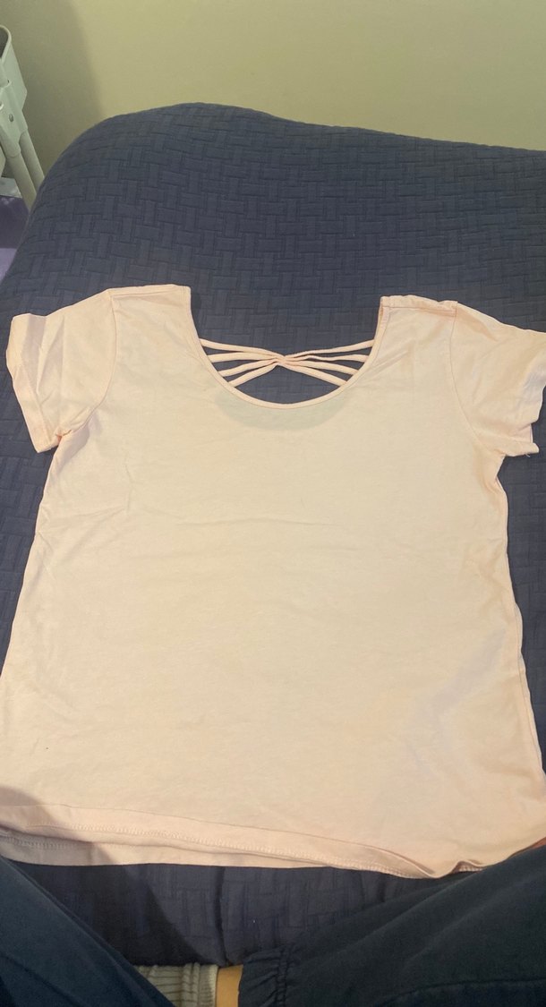 pamuklu, kısa kollu ve yuvarlak yakalı pembe tişört, şık çapraz sırt detayıyla günlük sokak stili için uygundur.