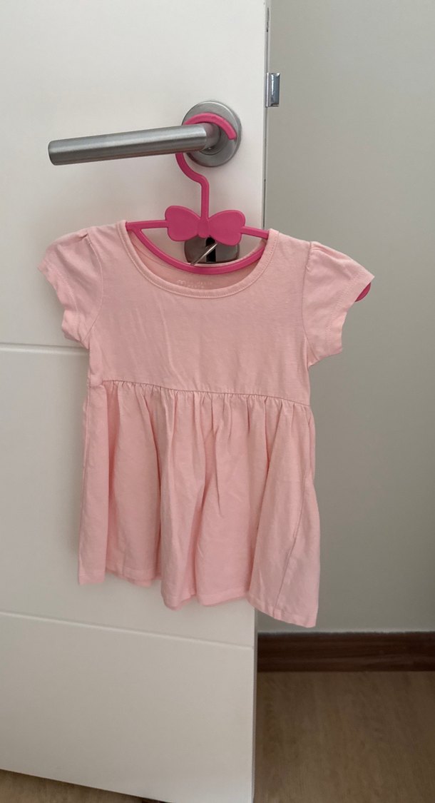 Pembe renkte, pamuk kumaştan, kısa kollu, yuvarlak yakalı, fırfırlı ve rahat kesim elbise. Düz ve pastel tonlarda.