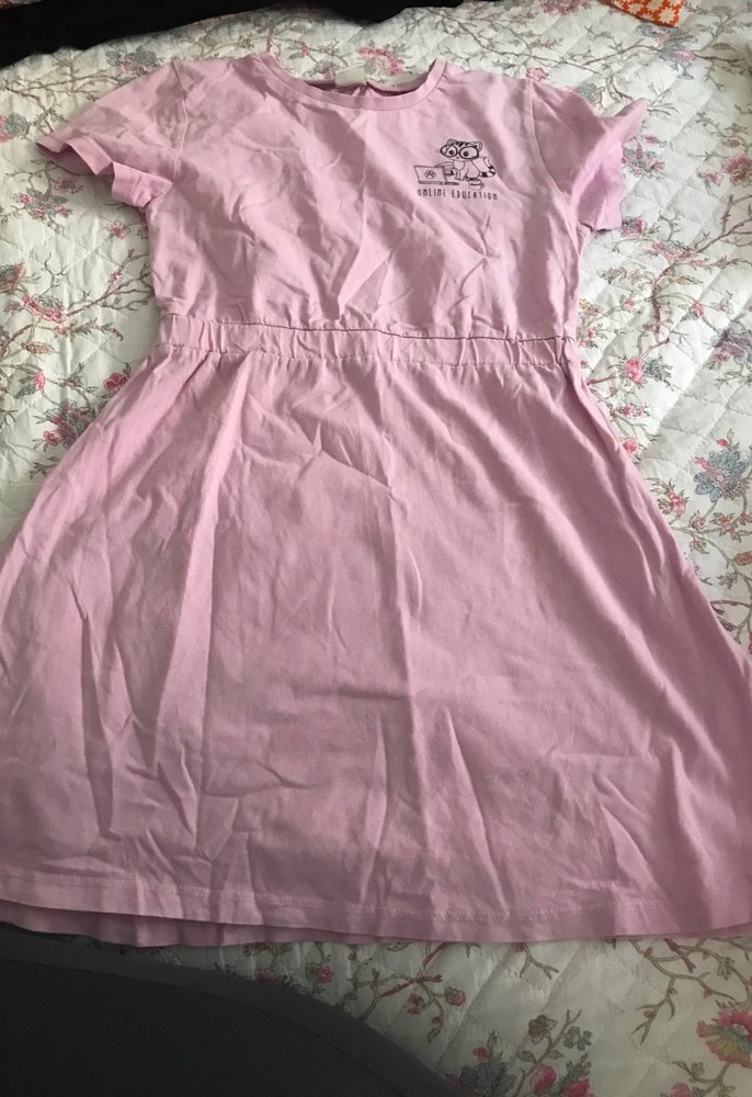 Pembe pastel tonlarda, kısa kollu ve yuvarlak yakalı pamuklu kız elbisesi. Salaş kesim ve fırfır detayı ile sade ve rahat bir tasarım sunar. Az kullanılmış ve hiç bir defosu yoktur çoçuğuna giy çıkar elbisesi çok rahat
